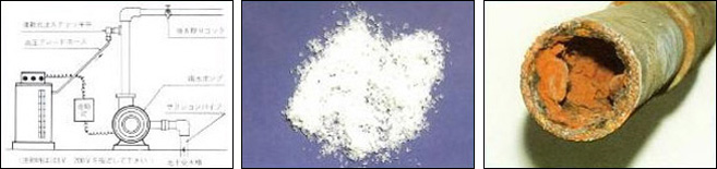 左記のように<クリアーフレッシュ>(メタ燐酸ナトリウム)の働きによって鉄管内面に皮膜が形成されるので、鉄と酸素の結合がなくなり、サビの発生(または増殖)が大幅に防止できます。この結果、赤水は解消し、殺菌用塩素を含んだ清潔な水が使用できます。