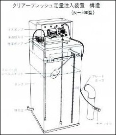 〈クリアーフレッシュ〉は赤水の防止だけでなく、配管の腐食並びにスケールの発生も防止しますので、配管の出発点である受水槽よりの揚水ポンプの吐出管に注入します。注入方法としては、クリアーフレッシュ定量注入装置N-400型、またはN-100型をご使用ください。揚水量と吐出量に合わせて、一定量の〈クリアーフレッシュ〉を自動的に注入します。